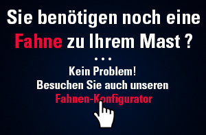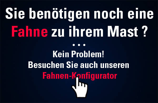 Nutzen Sie jetzt unseren kostenlosen Fahnenmasten-Konfigurator und gestalten Sie Ihre ideale Kombination aus Flaggenmast, Seilführung und Mastfuß – ganz nach Wunsch. Einfach ausprobieren, konfigurieren und Angebot anfordern!
