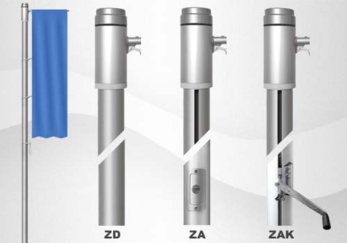 ZA90: im Mastrohr laufendes Perlon-Hissseil Ø 5 mm, Bediengehäuse mit schließbarer Tür und Schnellfixierungssystem (SFS)für Hissseil.