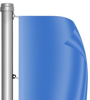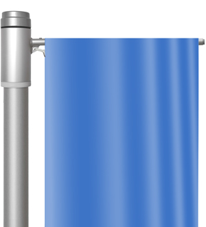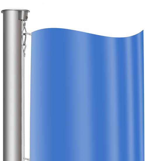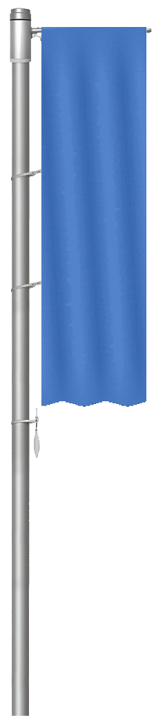 Seitliches Besatzband mit Haken. Hohlsaum am oberen Tuchrand, Ø 30,00 mm, beidseitig offen. Oberster Haken muss unmittelbar unter dem Hohlsaum angenäht sein. Abstand der Haken max. 1,00 m. Zum Aufziehen der Fahne wird diese mit ihrem Hohlsaum auf den Teleskopausleger gesteckt, Die seitlichen Karabinerhaken werden in die lose mitgelieferten Fahnenschlingen eingehakt. Die Fahnenschlingen drehen sich bei Windbelastung mit. Fahnengrößen (max.) von 1,50 x 4,00 m