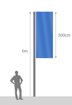 Eine 300 cm hohe Fahne würde z.B. an einem 6 oder 7 Meter hohen Masten gut passen, eine 400 cm hohe Fahne an einem 8 Meter hohen Masten.